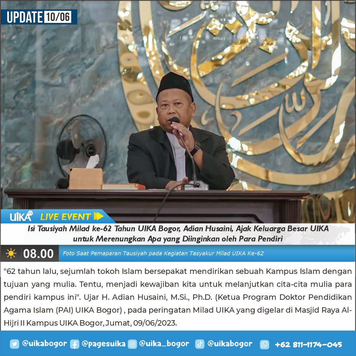 Merenungkan perjalanan 62 tahun UIKA, jangan kita lupakan sejarah berdirinya universitas-universitas Islam di Indonesia. Ini merupakan bagian dari jihad fi-sabilillah dalam bidang keilmuan. Rasulullah saw bersabda: “Jaahidul musyrikiina biamwaalikum wa-anfusikum wa-alsinatikum.” (Berjihadlah melawan orang-orang musyik dengan hartamu, dirimu, dan lidahmu).